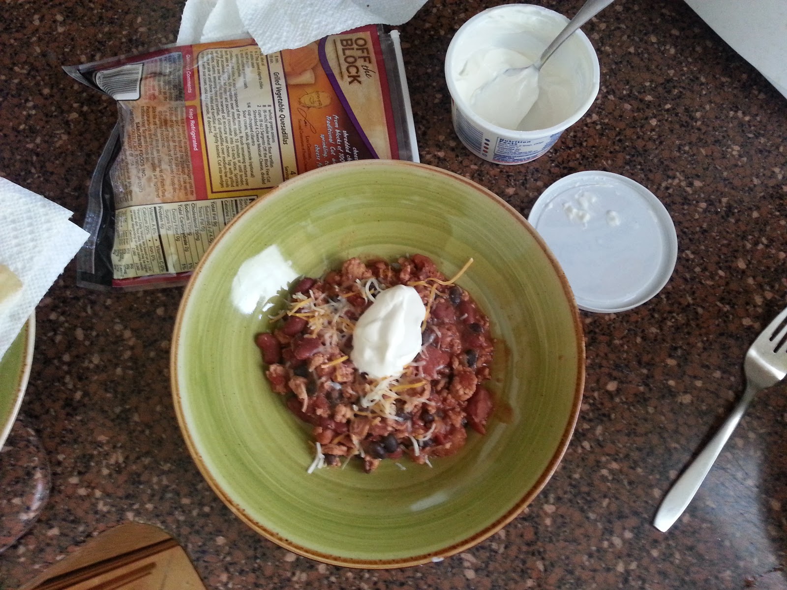 Serve in a bowl topped with a bit of cheese, sour cream avocado and crushed tortilla chips. All I had was cheese and sour cream :(. Enjoy!